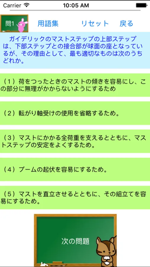 ①科目ごとに勉強でき、本番同様に5択で出題。