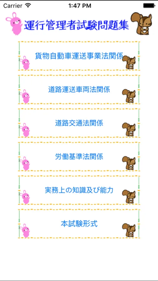 各科目から10問づつ出題され全40問で学習できます。また問題はその都度ランダムなため、何度でも試すことができます。