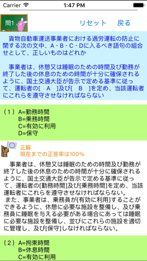 一問一答形式からなり、回答後、正答率も確認できます。