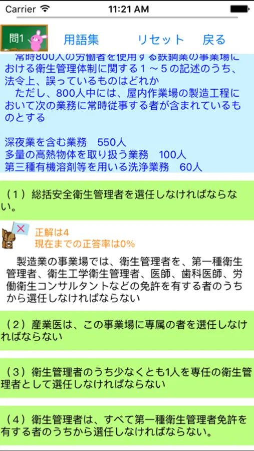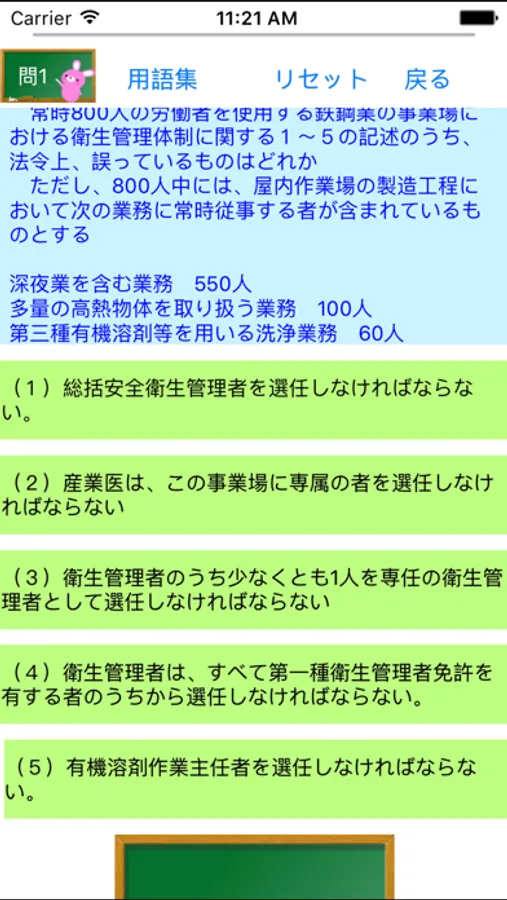 衛生管理に関する用語集を搭載しているため、トップページからの検索、問題を解いてる最中にも確認ができます。