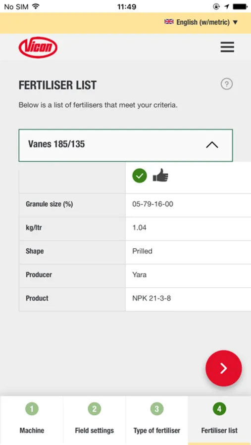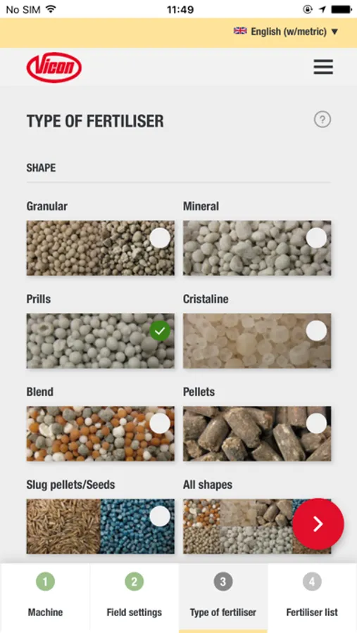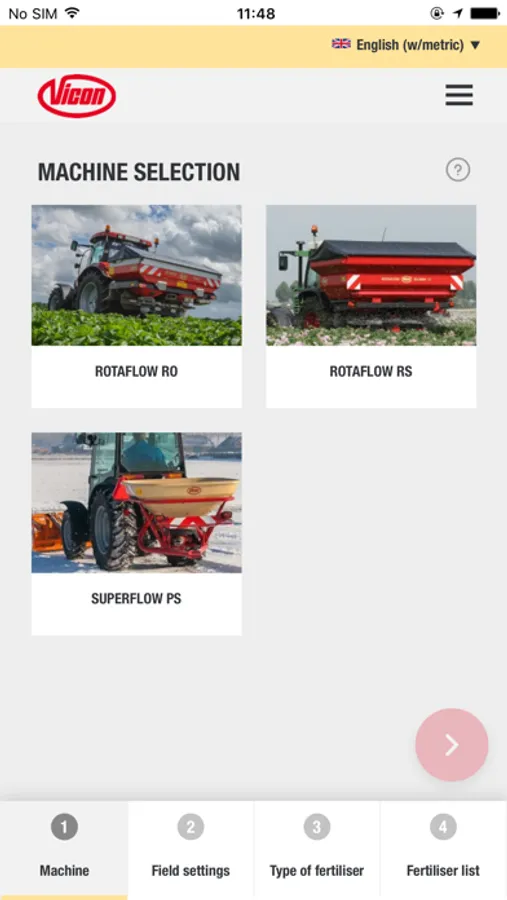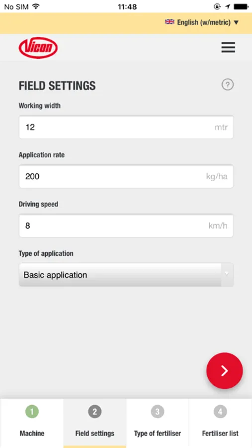 In just some steps, the App guide you to the correct advice for your Vicon fertiliser spreader, anytime, anyplace, anywhere for almost all commonly used fertiliser types.