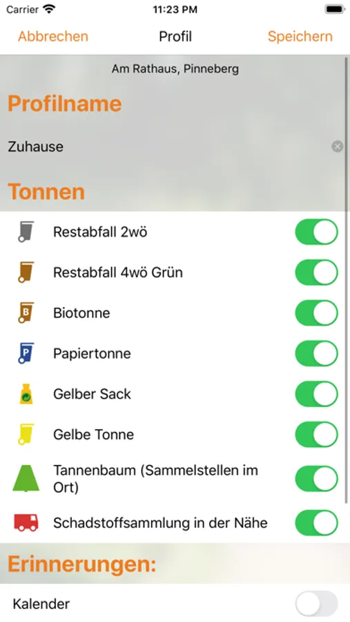 Bei der Profileinstellung wird ebenfalls festgelegt, ob das Smartphone an die bevorstehenden Abfuhrtermine über die Lokale Benachrichtig und / oder über den Kalender erinnert. Außerplanmäßige Terminänderungen werden in beiden Fällen berücksichtigt.