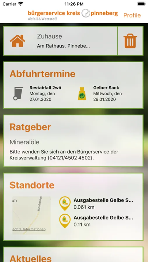 Welcher Wertstoff kann wann, wo und wie entsorgt werden? Die abfallapp ermöglicht den schnellen Zugriff auf die individuellen Abfuhrtermine. Sie werden an alle Termine für maximal fünf Standorte nach vorheriger Einstellung erinnert. Im Profil werden die persönliche Standorte ausgewählt. Über einen Schieberegler wird eingestellt, über welche Abfuhrtermine eines bestimmten Wertstoffes informiert werden soll.