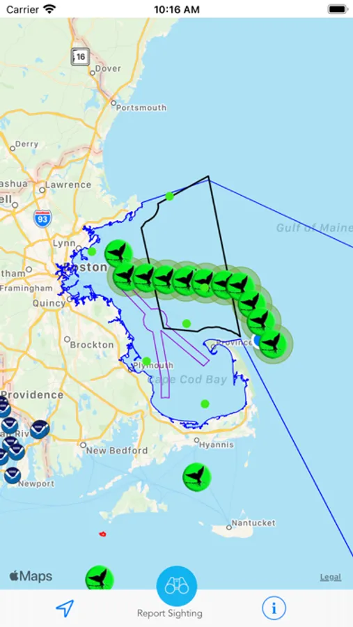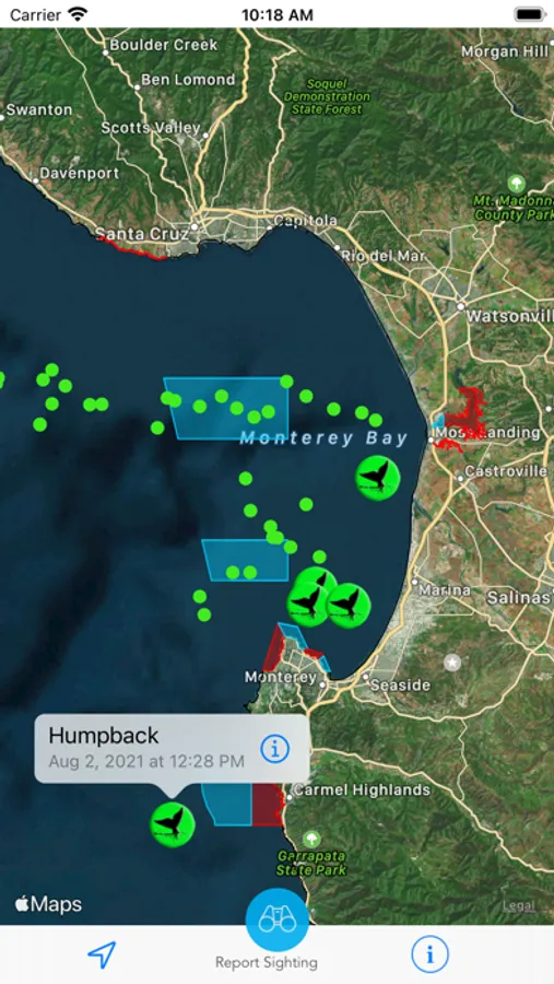 Whale Alert now supports reporting of whale sightings by the maritime community and the broader public. This information is shared in real-time with leading whale researchers and state and federal management authorities. In some cases, whale sightings will trigger confirmation “over-flights” by the National Marine Fisheries Service (NMFS) or the United States Coast Guard (USCG) who will then determine whether or not temporary speed restrictions should be created (Dynamic Management Areas).
