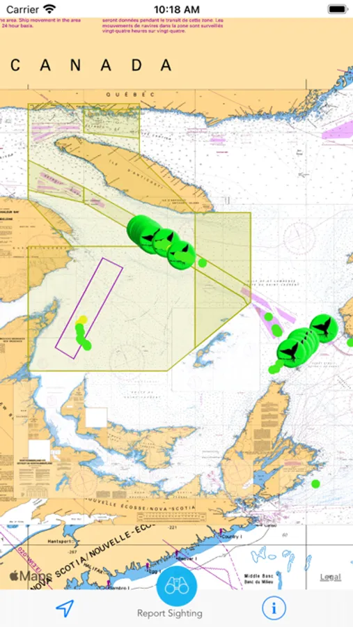 Whale Alert helps reduce the chance of fatal ship strikes by large vessels by displaying active whale management areas, required reporting areas, recommended routes, areas-to-be-avoided and near real-time warnings in shipping lanes along both coasts of the United States and Canada. This information allows vessel operators to avoid collision with whales by slowing down and heightening their visual awareness.