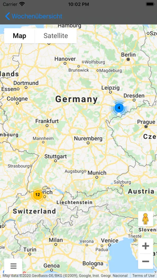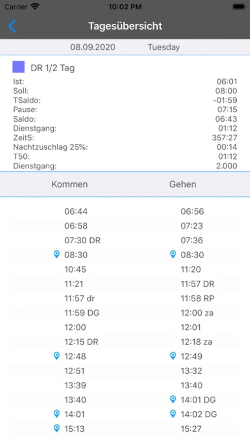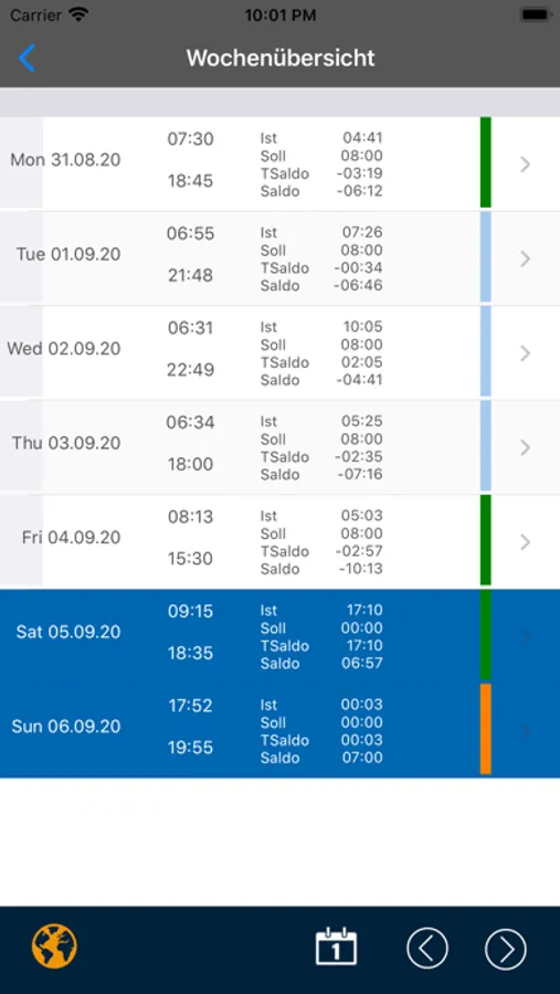 Wochenweise Übersicht über alle relevanten Daten wie z. B. Buchungen, Soll-, Istzeit, Überstunden, Urlaub
