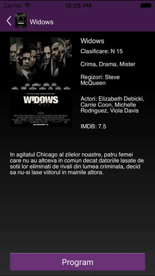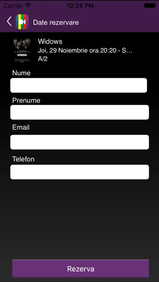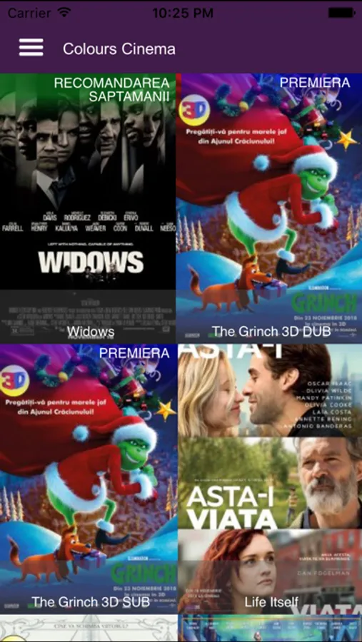 Afiseaza programul filmelor din cinematograful Colours Craiova. Permite rezervarea de locuri pentru spectacolele din program direct de pe telefonul mobil. Prezinta detalii despre filmele care ruleaza in cinematograful Colours si ofera recomandarea saptamanii. Rezervarile pot fi adaugate in calendarul telefonului in vederea alertarii sau pot fi trimise notificari prietenilor, prin retelele de socializare, direct din aplicatie.