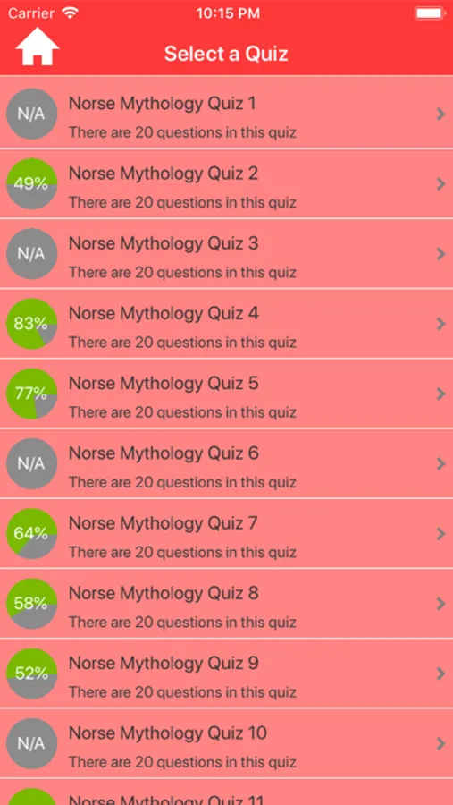 - You can review a quiz session performance details by selected a session. This screen shows quiz history performance reports.