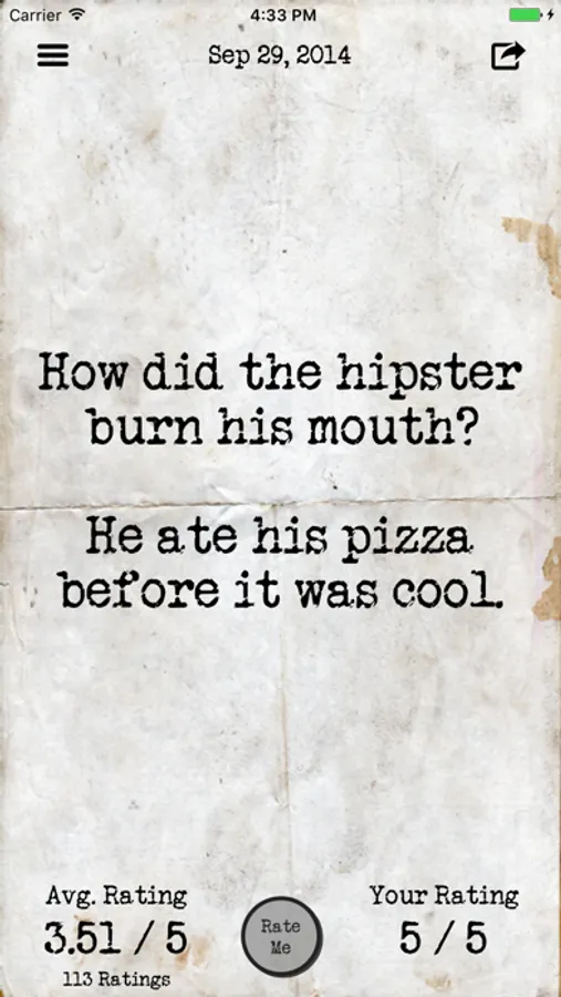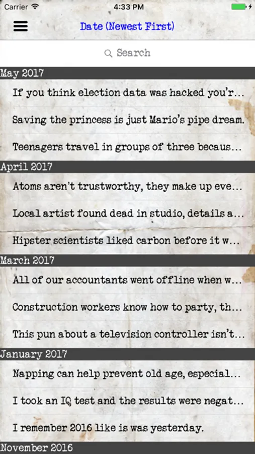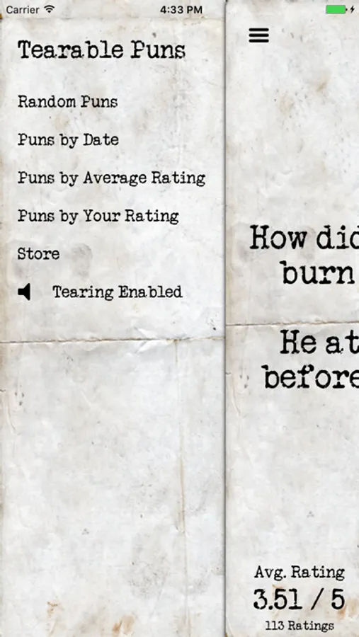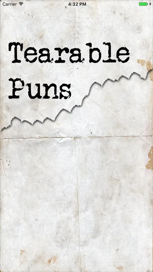 Tearable Puns contains puns on a variety of subjects. You can navigate between puns on the main screen by tearing each TEARable pun off the screen. Share and rate puns! View, sort and search all puns within the app! Updated with new puns regularly!