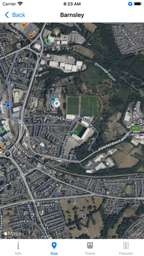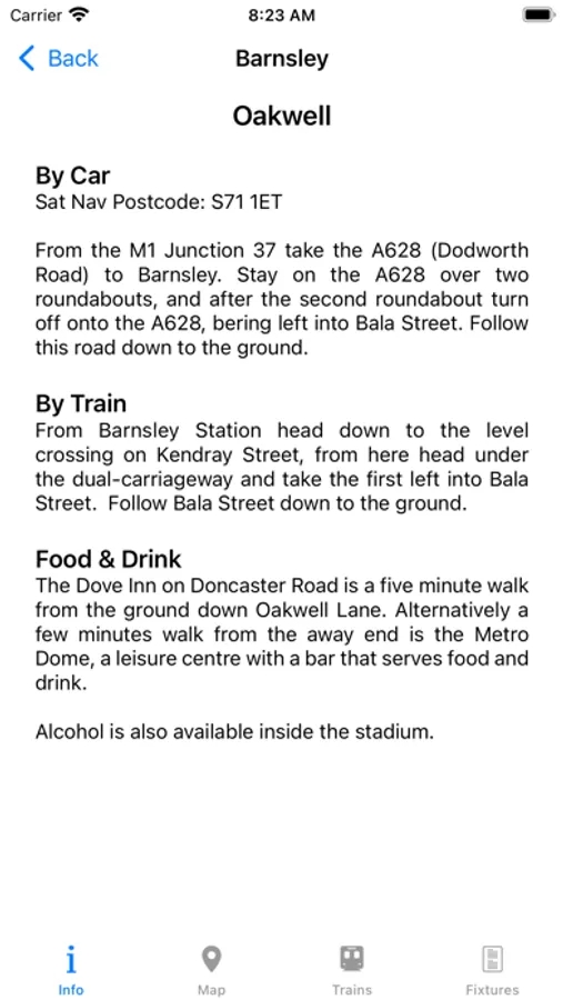The app shows a map of each ground with your location relative to the stadium, live train departure times for the nearest railway station to the ground, has local pub information, and fixtures for each club.