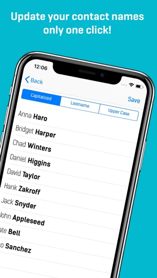 ContactName is a simple program to format your contacts' name. You can capitalize, uncapitalize or capitalize only first letter all your contact list with a simple tap.