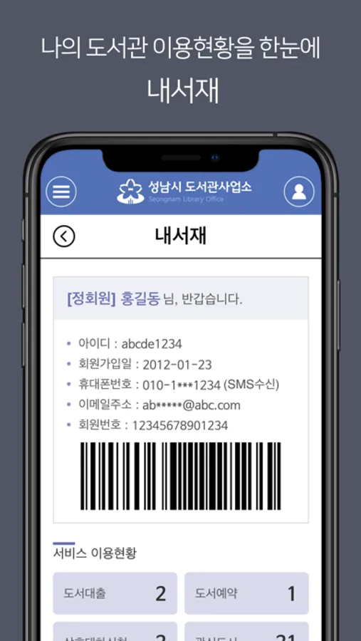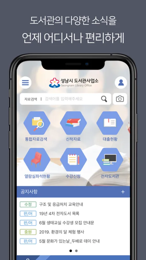 성남시립 도서관 용 앱. 성남시립 신착 도서,대출 이력 정보 확인 및 대여 열람할 수 있는 앱.