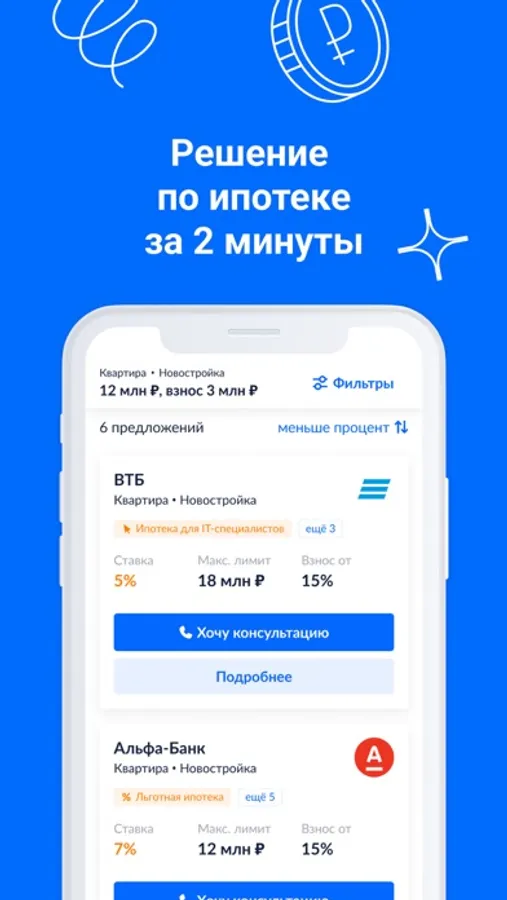 Ипотека. Сервис, с помощью которого можно отправить одну анкету сразу в 7 банков и получить персональные предложения всего за 2 минуты! Останется только выбрать то, которое подойдет лично вам.