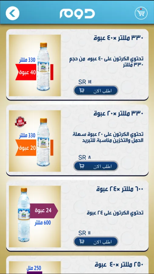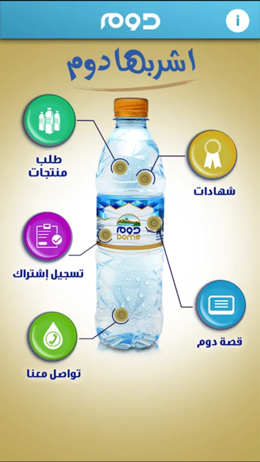 تقديرا لعملائنا وحرصنا على تسهيل عملية التواصل وطلب المنتجات نقدم لكم تطبيق الجوال الجديد الذي يحتوي على الميزات التالية وهي إمكانية طلب منتجات مياه دوم لأكثر من 12 نوع و منتج بتصنيفين (منتجات الكرتون – منتجات إستبدال الكوبونات) و تسجيل إشتراك أول مره بعنوانك، يمكن الدخول عليه لاحقا عبر رقم جوالك مباشرة وبدون الحاجه إلي حفظ كلمة المرور وأسم المستخدم و إمكانية تحديد مكان التسليم عند إتمام عملية الطلب عبر الإحداثيات GPS بجهازكم وبدون الحاجة إلى كتابة عنوانكم بالتفصيل "ميزة إختيارية يمكن التحكم بها" وايضا صفحة تحتوي على جميع قنوات التواصل المباشرة والإجتماعية صفحات تعريفية عن أدق تفاصيل منتجات دوم "جميع الطلبات تطبيق الجوال خاصة بمدينة "الرياض والمزاحمية وضرما ويتم توصيلها في اقل من 48 ساعة والدفع بعد التسليم