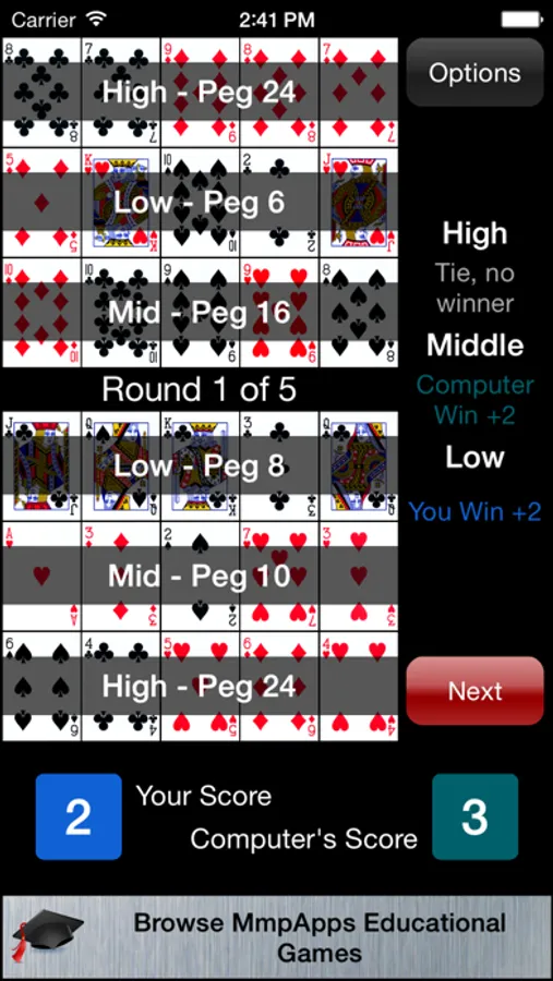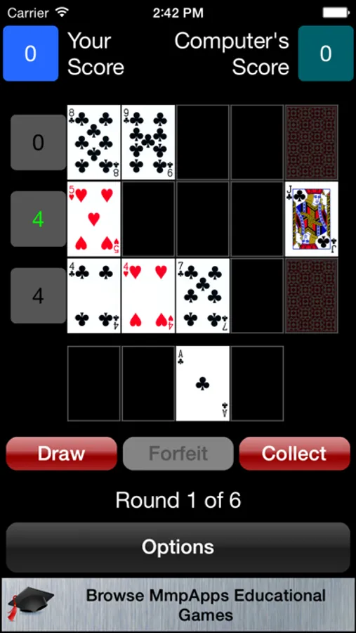CRIBBAGE CONFLICT: A competitive variant of Cribbage Square where you take turns with an opponent placing cards on the board. You score the rows (horizontal) and your opponent scores the columns (vertical). You can play the computer or a friend using Pass-and-Play.