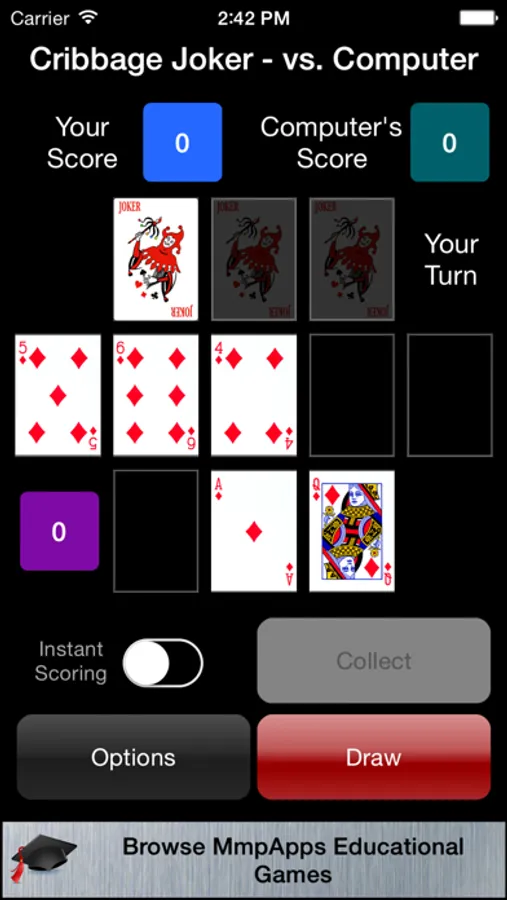 CRIBBAGE JOKER - You draw sets of cards to make the most valuable crib hands possible but try not to get jokered. If you draw three joker cards you lose your turn.