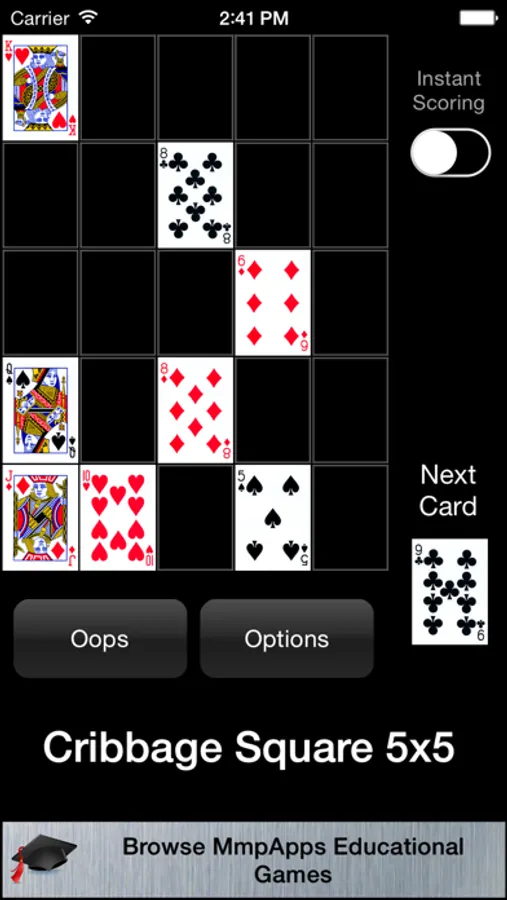 CRIBBAGE SQUARE - The classic Cribbage solitaire game where you place cards in a 5x5 grid and each row and each column is scored as a separate crib hand. cribbage Square can be played in three variants 3x3, 4x4 and 5x5.