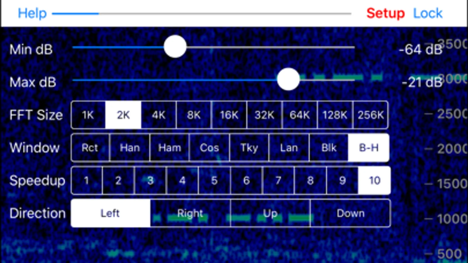 When first started, Godafoss defaults to an FFT size of 4K, with a Hanning window. You can change these and other settings by tapping the Setup button, and a set of controls will appear: