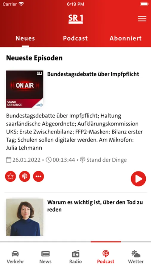 In der neuen Podcast-Übersicht sind alle Angebote von SR1 direkt zu sehen. Es besteht die Möglichkeit, Podcasts zu abonnieren – Nutzerinnen und Nutzer werden automatisch benachrichtigt, sobald eine neue Podcast-Folge zur Verfügung steht.