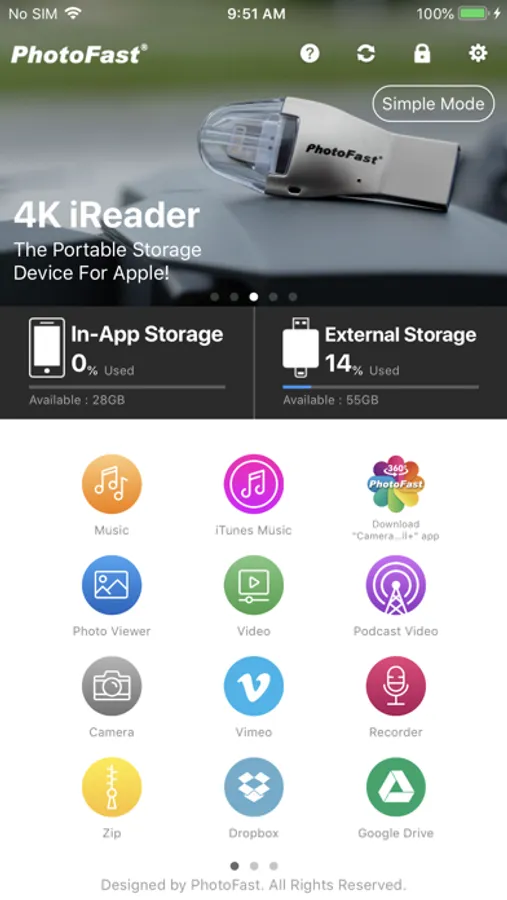 Save space with the built-in camera function, shoot photos/videos and save them directly to PhotoFast drives. PhotoFast camera also has advanced manual control + save as RAW (iOS 10 - iPhone 6s / iPad Pro 9.7 and later).