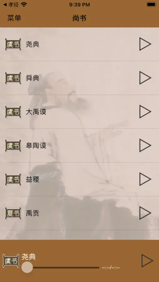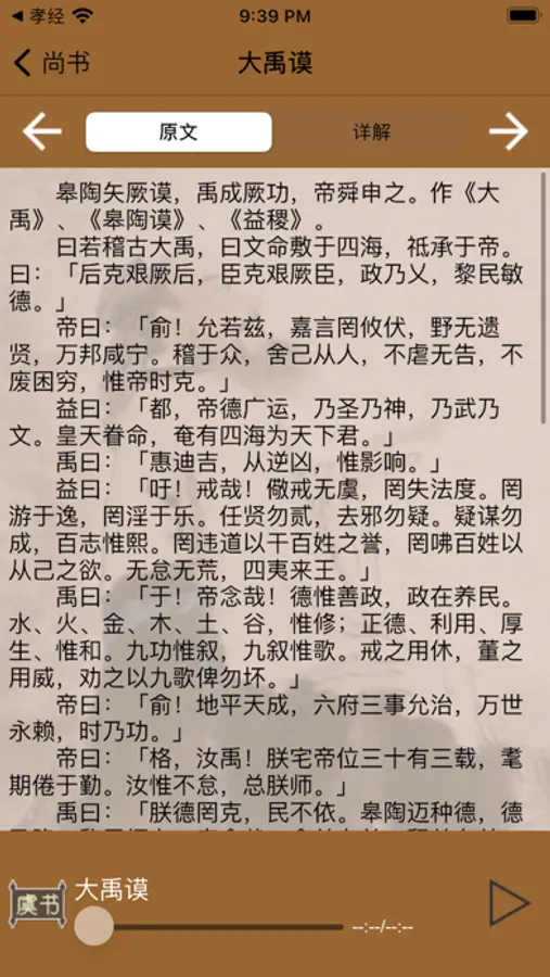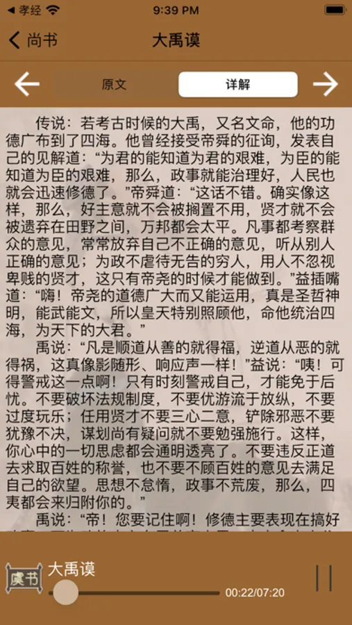 《尚书听读》是专为国学爱好者提供的国学宝典,突破书本和光盘载体方式,其中包含尚书58篇真人原文朗读、原文详解,操作简单,可以对诗歌循环复读,并配有优美的背景音乐,是国学爱好者真正的国学听读机,国学爱好者可充分利用碎片时间听、读,达到快速强化学习和熟悉尚书的目的。
