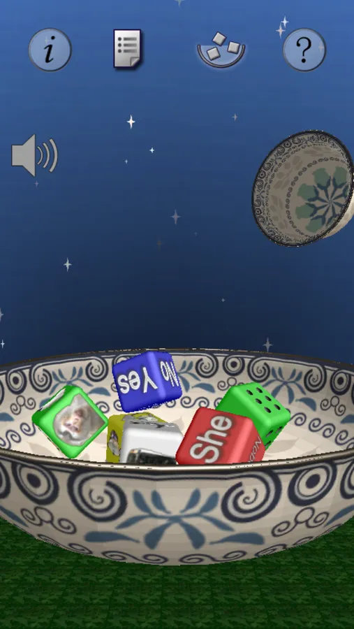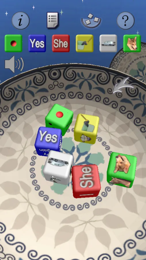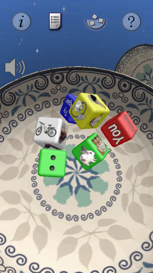*up to twelve types of dice installed as default("Standard”/"Answer”/"Numeric”/"Letter”/"Housework"/"Where"/"Drinking"/"Dining"/"Who”/“Transport”/“Photo Housework”/“Animals”)