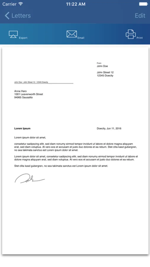 With this app you can easily compose letters and send them afterward via e-mail, print them or use all AirDrop options. Your letter is generated as PDF, optional with your signature.