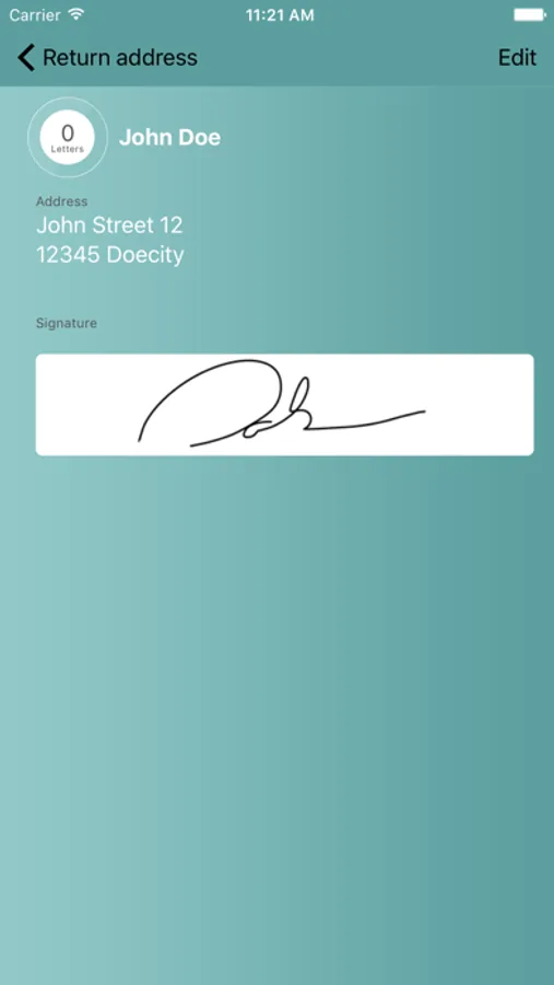 You can set up any number of return addresses. Thus you can add e.g. your private and your business address and the address of your partner as sender. Add your signature by sweeping across the screen with your finger on the signature field. When you are writing a letter, simply select a return address.