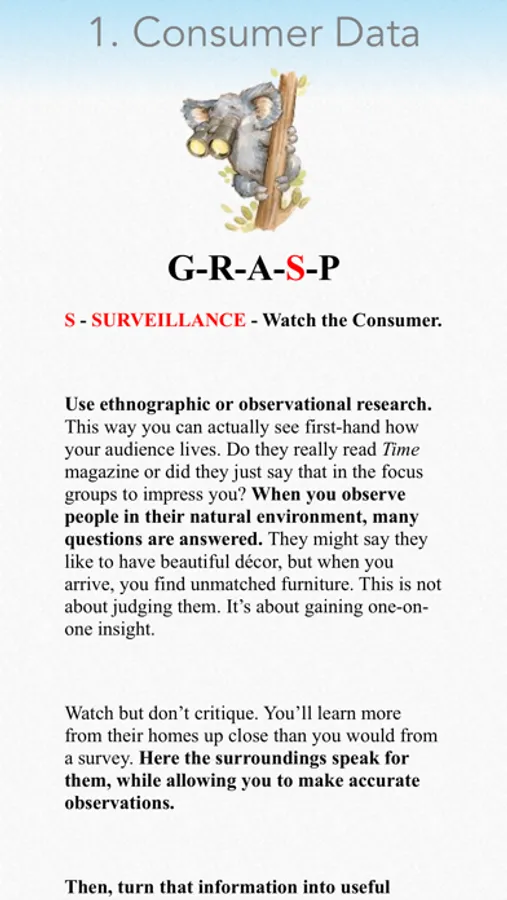Each one of the tactikPAK™ apps examines a specific principle. Every principle has a matching acronym. For example, in Copywriting, G-R-A-S-P reminds you to understand and then incorporate consumer research. Use the information to guide the creative solution. This will help you develop an on-target and on-strategy message.