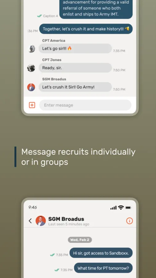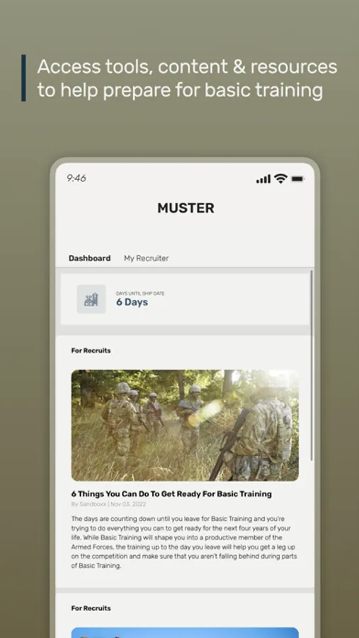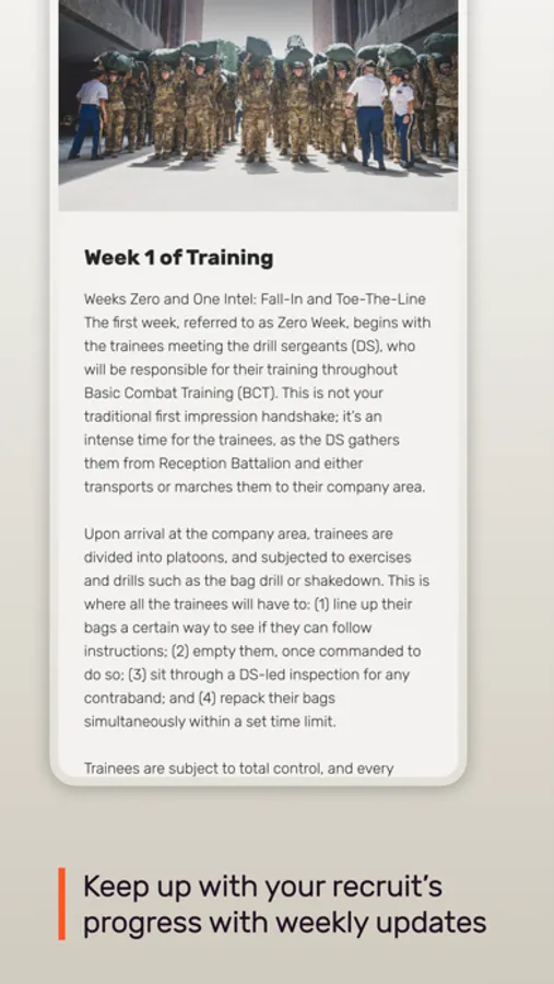 Stay up to date on your recruit as they progress through basic training. Learn about what they are going through on a weekly basis, all accessible within the Sandboxx app.