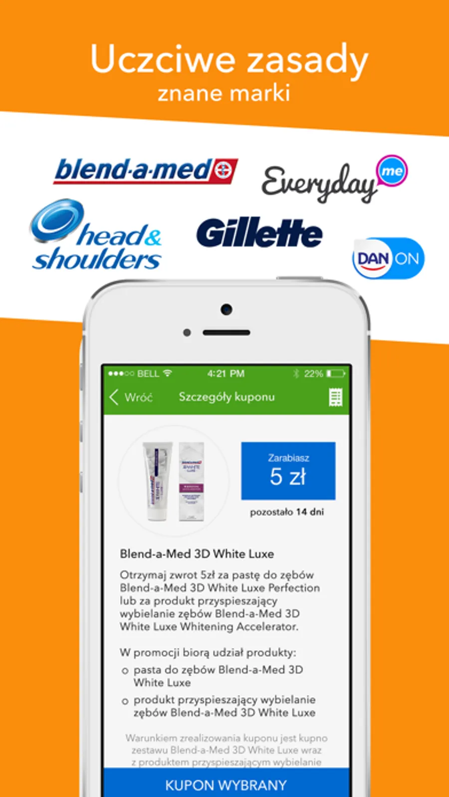 W aplikacji pojawiają się kupony takich marek jak: Saga, Żywiec Zdrój, Frosta, Monini, Kruszwica i wiele, wiele innych.