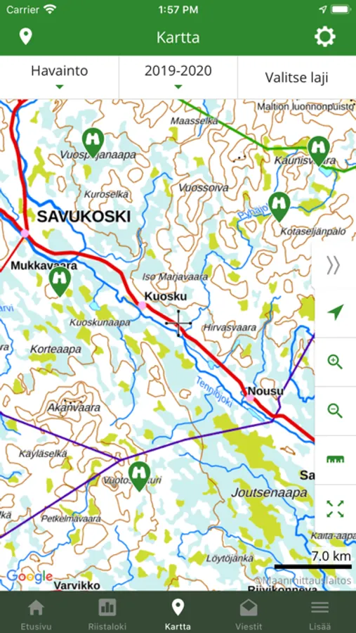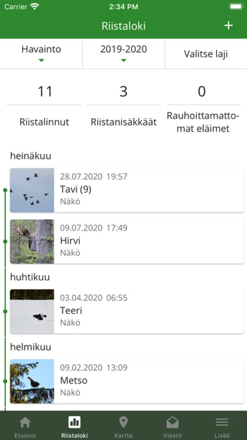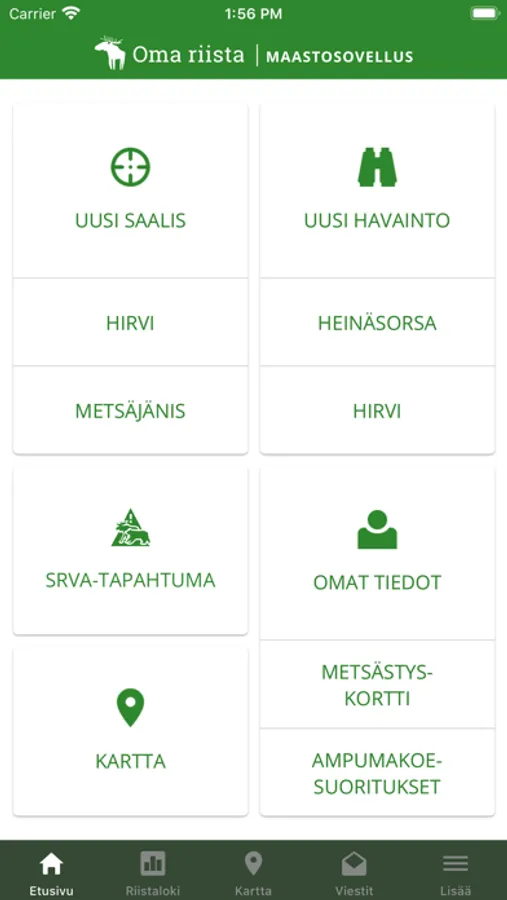 Oma riista -mobiilisovelluksella pidät helposti henkilökohtaista riistapäiväkirjaa eli riistalokia omista riistaeläinhavainnoistasi tai -saaliistasi. Sovellus tukee myös suurriistavirka-aputapahtumien (SRVA) tallentamista. Sovellus tallentaa tapahtuman paikan ja ajan automaattisesti. Voit liittää tapahtumaan kuvan ja kirjoittaa vapaamuotoisen muistiinpanon.