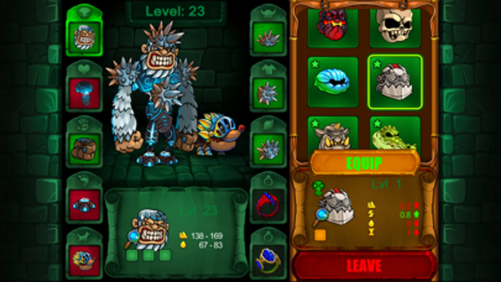 Create your custom monster from various body parts just like Frankenstein! Mix all kinds of legs, arms, head types and equip it with proper armor.
