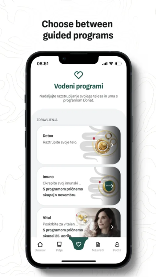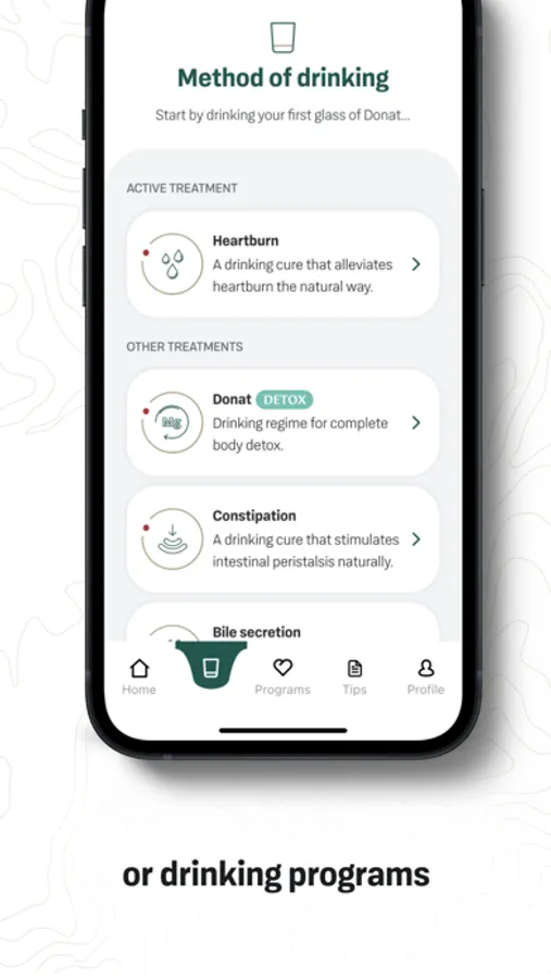 Donat natural mineral water helps maintain health – and can even eliminate a number of medical problems. For centuries, people have been coming to Rogaška Slatina for treatment using therapeutic mineral water and other natural medical procedures. Based on an examination and any subsequent tests ordered, your doctor will prescribe Donat from the spring at the Rogaška Medical Centre and advise you on the best way to take it. This app will help you take the Donat drinking cure properly at home. It gives instructions on how to use Donat natural mineral water preventively or for a range of medical problems.