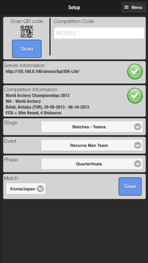 Setup is a breeze using the QR-codes provided by Ianseo on the printable scorecards. A single scan of the code provides all the information needed to set up the the device. Score multiple targets with the same device. The app is translated into multiple languages and new languages are available for download directly from Ianseo.