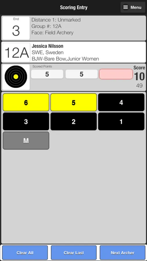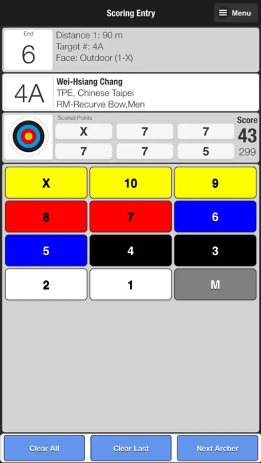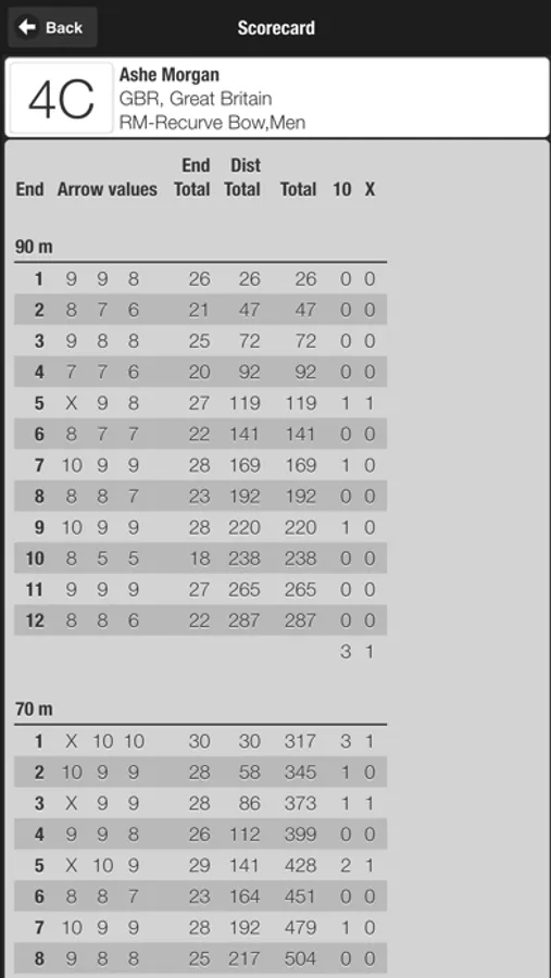 The app handles scoring for qualification rounds, elimination rounds, individual matches and team matches. Information is clearly displayed showing archer name/country, target placement, end number, target type and number of arrows to be scored. Archers can easily enter scores per end using the large scoring buttons. Swiping the screen provides a quick and easy way to navigate between archers and ends. An electronic scorecard is available to see all arrows shot, end totals, distance totals, and a running total for the whole competition. Online help is available directly in the app.