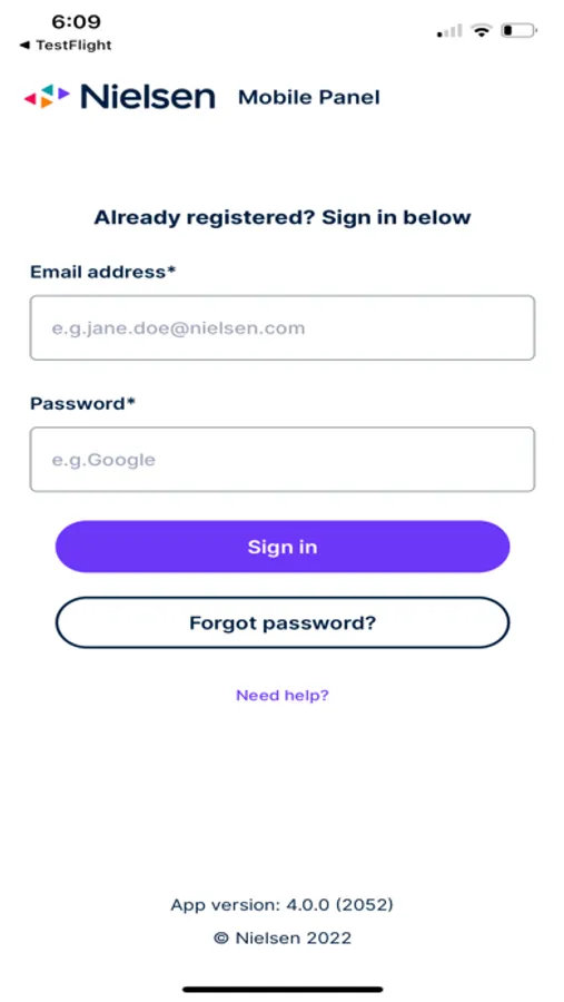 Before downloading our Nielsen Mobile App, you must first sign up using our registration form (if you were directly invited to participate, use the provided information to register your account). Once your registration is submitted, you can download this app to your smartphone or tablet.