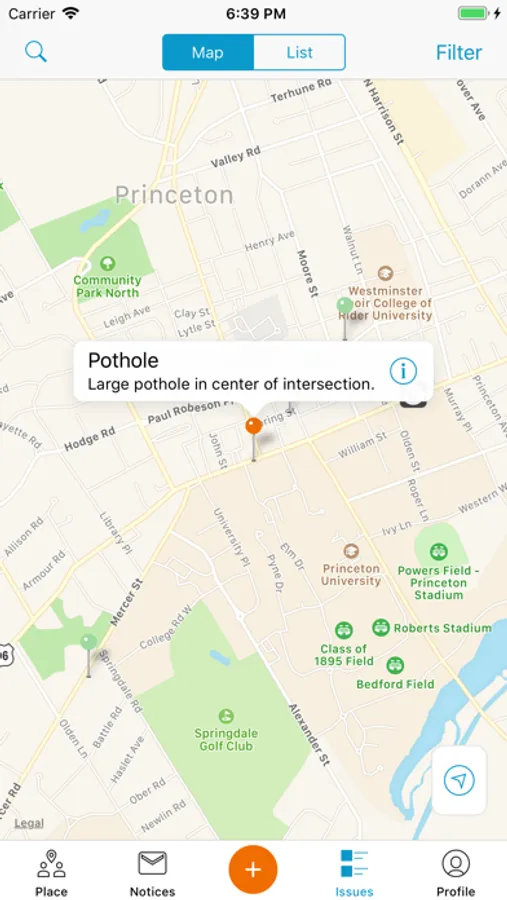 For those potholes, damaged street signs, and other local problems that need attention, the Access Princeton app makes reporting a problem easier than ever. This app uses GPS to recognize your location and gives you a menu of common quality-of-life conditions to select from. The app allows you to upload pictures or videos to accompany your request. The mobile app can also be used for a variety of other issues such as street maintenance, street light issues, damaged trees, parking meters, and others. Residents can track the status of reports they or other members of the community have submitted. Residents can also call Access Princeton (609-924-4141) for information on any municipal service and to report a problem in town or visit us at Monument Hall, 1 Monument Dr., Princeton, NJ for free notary service or general town information.