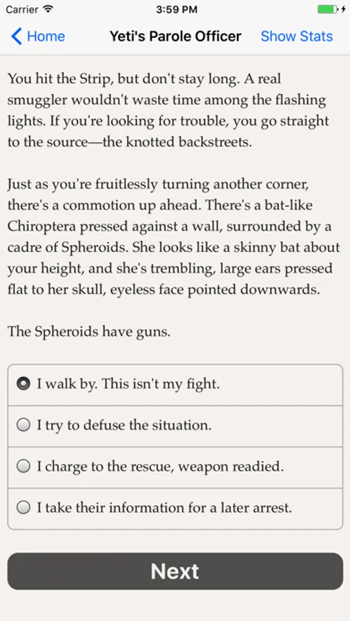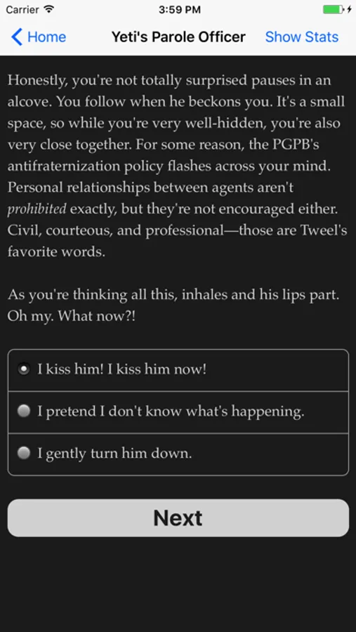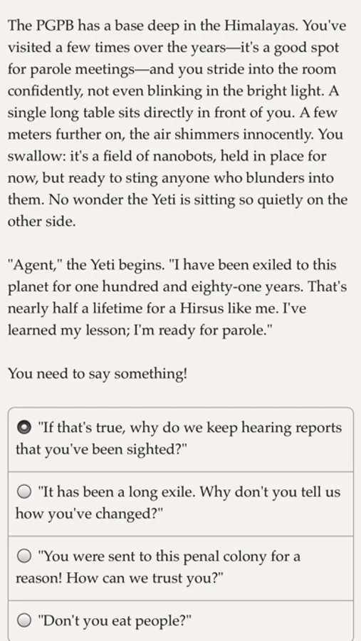 "Yeti's Parole Officer" is a hilarious interactive sci-fi novel by KT Bryski, where your choices control the story. It's entirely text-based--without graphics or sound effects--and fueled by the vast, unstoppable power of your imagination.