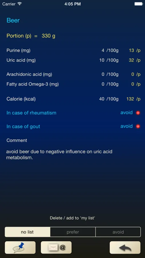 Information on calories, purine, uric acid, arachidonic acid and omega 3 fatty acid.
