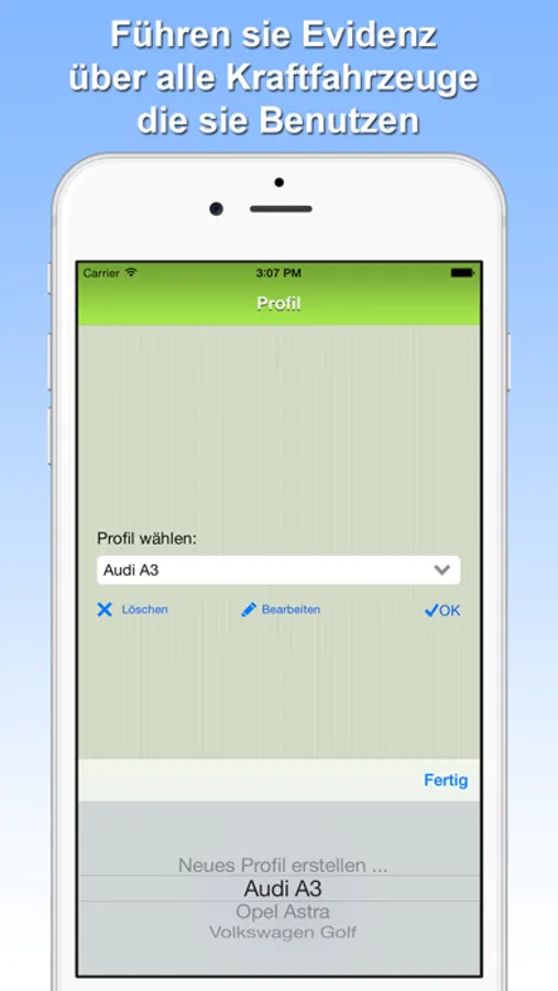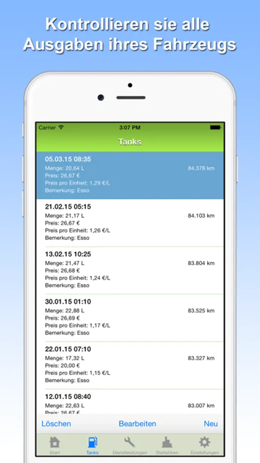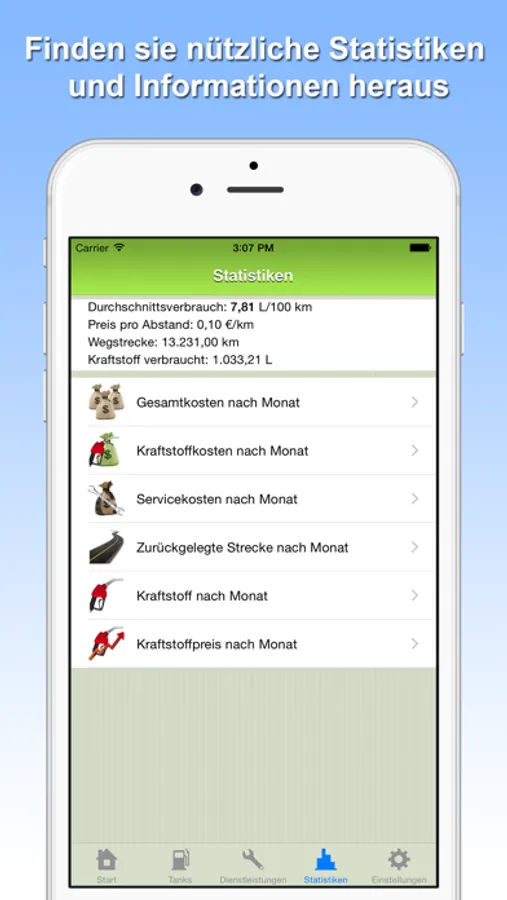 Durch die Evidenz des Tanks während eines Tankstellenbesuches können sie viele Informationen über die Benzinkosten ihres Wagens und andere Statistiken über seinen Gebrauch herausfinden.