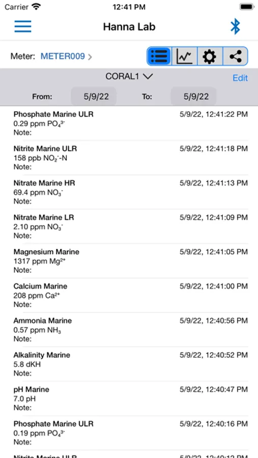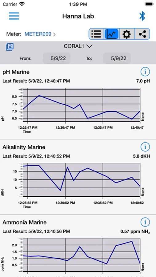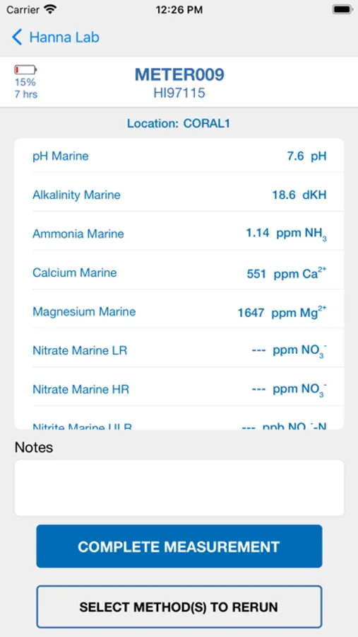 When used with a HI97115 Marine Master waterproof multiparameter photometer, functions include method groups, data sharing, and location trend data. Readings can be collected using the Hanna Lab App or synced directly from the HI97115 meter. All saved readings are visible in the log history. Readings can viewed by meter, location and method. Readings can be displayed as tabulated data or as a individual method graphs or a multiparameter graph with user-selectable axes. The graph can be panned and zoomed with pinch-to-zoom technology for enhanced viewing. A demo meter has been included showing all the features of this meter.