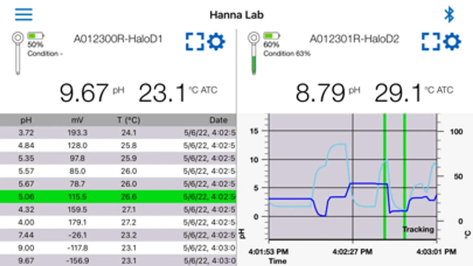 - Sample tagging with annotations by pressing the HALO pH probe button, or by pressing the probe icon on the iOS device