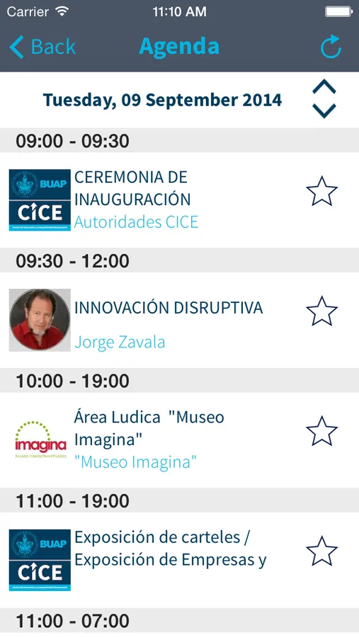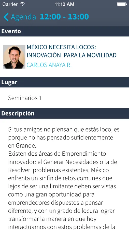 Agenda: Encontraras el calendario de los eventos para un congreso en especifico, podrás seleccionar tus eventos favoritos, así como obtener mas información sobre cada uno de estos y compartirlos por redes sociales.