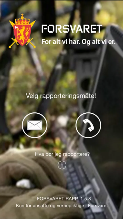 From the Norwegian Armed Forces Rapp, you can report undesirable incidents that occur during the performance of work. Examples of this can be accidents with damage to personnel, equipment and the environment, approaches to accidents, illness that has its cause at work, deviations (breaches of civil and military regulations) and suggestions for improvement that can reduce the risk of accidents and adverse events. The information you register must be ungraded.