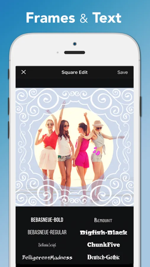 Add beautiful text to your photos with many fonts and styles. In fact, you don't even need a photo! You can just make a design using the background colors, patterns and border styles and then type in your message. Easy!