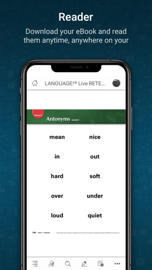 For several Voyager Sopris Learning products, including LANGUAGE! Live, LANGUAGE! 4th Ed., Transmath, and Vmath, eBooks offer a rich, interactive format for use in your classroom. eBooks provides embedded multimedia, assignments, links to external resources, search capability, pages viewable as thumbnails, and analytics. Teachers can communicate with students and make assignments directly inside the eBooks.