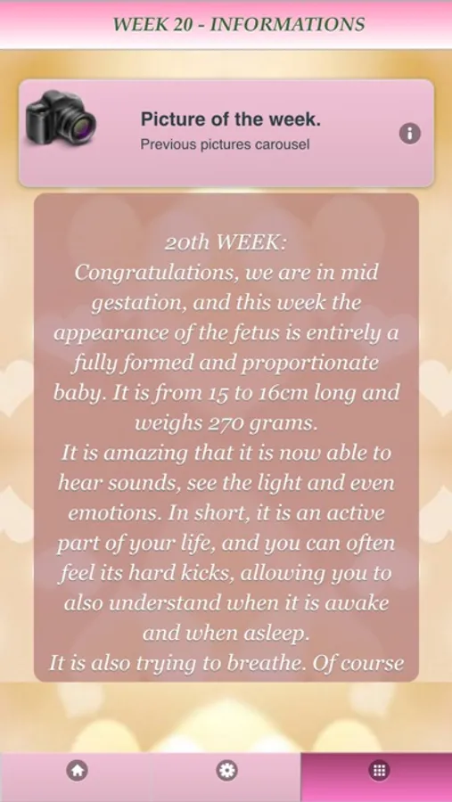Every week we bring information on the child's growth (text & pictures), passing from the state of embryo to fetus, describing the development of internal organs, limbs, skin, sensory organs, etc.