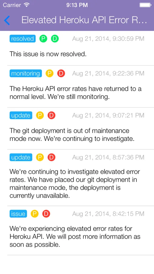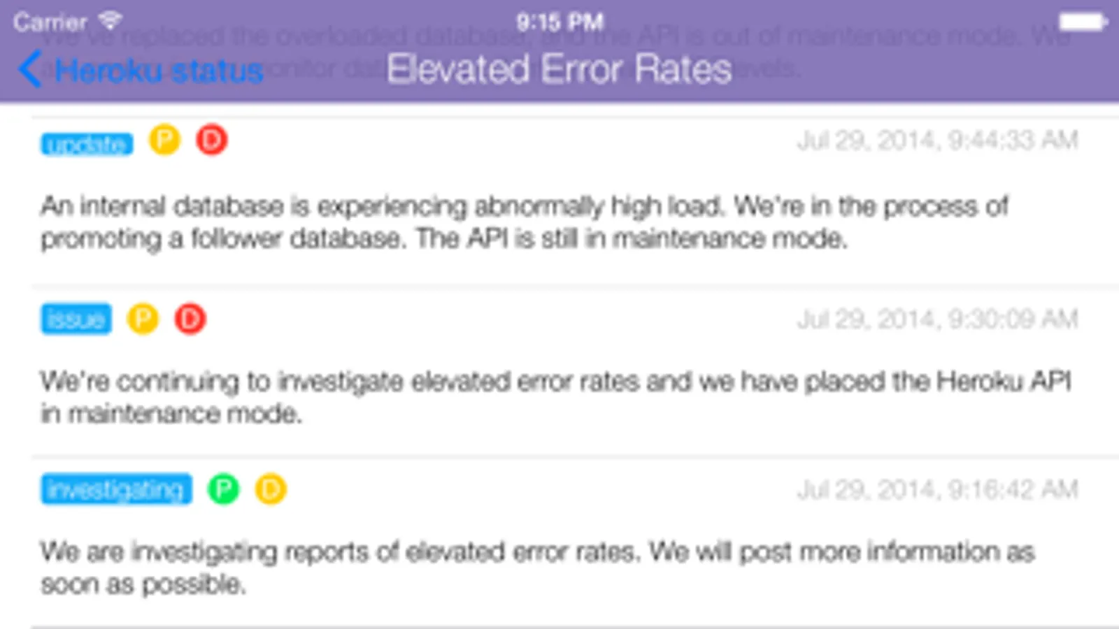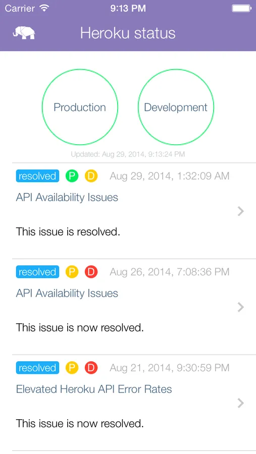 Hero Status is a simple to use app that gives you quick access to Heroku status. Easily refresh current Heroku apps statuses or browse through previous updates and issues.