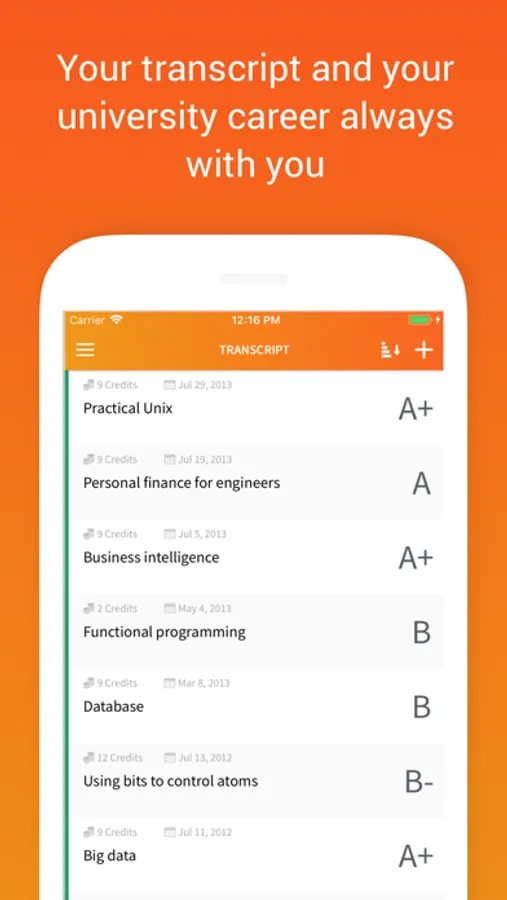 Its main feature is to work as a digital transcript, where you can enter your exam information and in a moment see your average and the total number of earned credits. You’ll also be able to see charts that describe different trends of your university career, and you can have a look to the future to see how your average can change according to the result of your next exam.